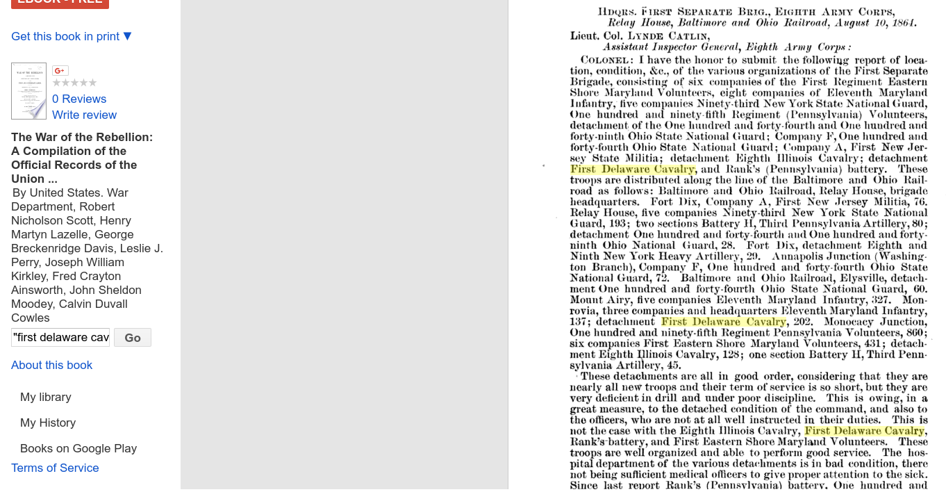 “…we have copies of reporting from the 1st Del Cav from 1864-65 at Monrovia…The entire Regt was ordered there 16 May, 1864 from Relay House…the 1st Del Cav was assigned to the Cavalry Reserve at Camp Cheseborouth in Jan 1864…From there the 1st Del HQ was at Camp Meade until it moved to Relay House on 11 April then elements to Monrovia on 8 May…” - From an email of Vince and Terry Zalenski