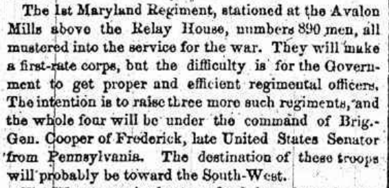 The 1st Maryland Regiment, stationed at the Avalon Mills above the Relay House, numbers 890 men, all mustered into the service for the war. They will make a first-rate corps, but the difficulty is for the Government get proper and efficient regimental officers, The intention is to raise three more such regiments, and the whole four will be under the command of Brig.-Gen. Cooper of Frederick, late United States Senator from Pennsylvania, The destination of these troops will probably be toward the South-West.